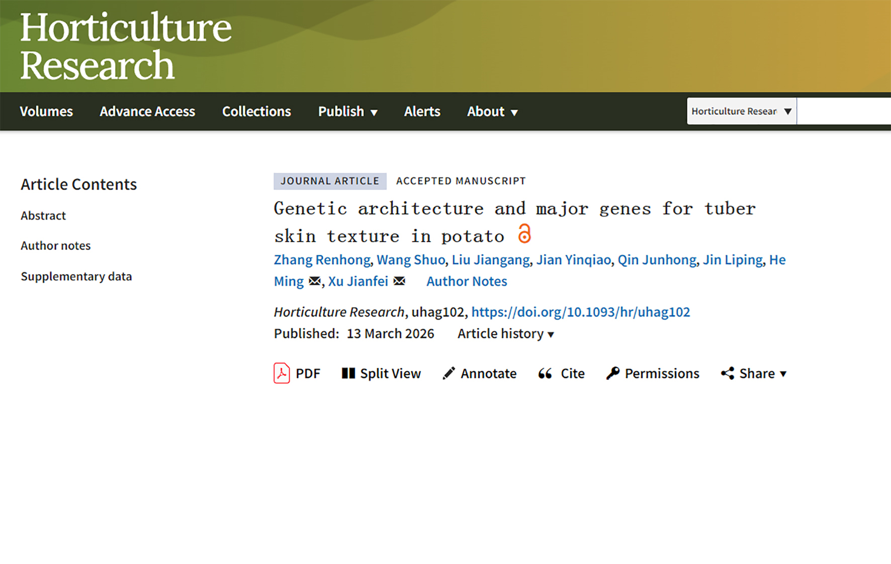 Recently, the potato research team at our institute published a study titled "Genetic architecture and major genes for tuber skin texture in potato" in Horticulture Research (…