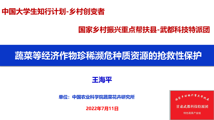 为促进“十四五”国家重点研发计划“农业生物种质资源挖掘与创新利用”重点专项项目“蔬菜等经济作物珍稀濒危种质资源的抢救性保护”的顺利实施,落实国家科技创新有关部署安排和国家乡村振兴计划,2022年7月11日,中国农业科学院蔬菜花卉研究所种质资源研究室举办“蔬菜等经济作物珍稀濒危种质资源的抢救性保护”线上培训会。中国大学生知行促进计划“乡村创变者”项目参与者(包括来自中国农业大学、上海交通大学、青岛农业大学、北京科技大学、东南大学、江南大学、山西农业大学、东北农业大学、四川农业大学、河北农业大学等高校10支团队同学)、甘肃武都区农业农村局相关领导、各乡镇相关科技人员、合作社负责人以及农民等共计400多人参加了培训会。
