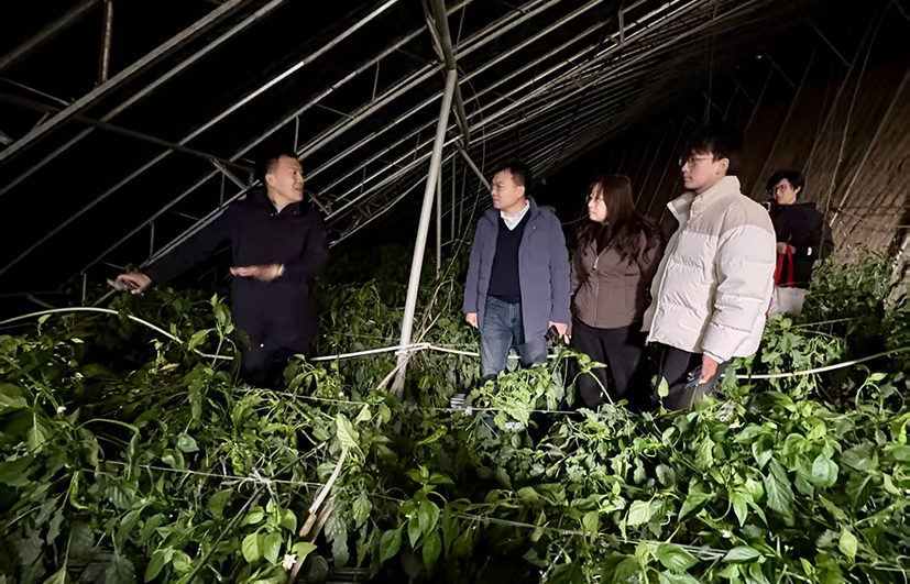 专家们深入设施蔬菜大棚查看灾情,针对积雪压棚隐患,现场指导农户采取“及时清除积雪+加固立柱保护棚体”双保险措施。专家强调,需及时修补破损棚膜,拉紧压膜线,防止冷风灌入引发二次灾害。同时,针对连续雨雪天气引发的棚内温度下降、病害风险增加等问题,专家团制定了"控温为先、预防为主"的方案,建议科学通风,可采用"分段式通风法"——即午间开小口缓释湿气,避免温度剧烈波动损伤植株。在快速提升作物抗逆能力方面,专家建议,对蔬菜植株合理追施速效肥,增强植株耐寒抗冻能力,促进恢复生长。