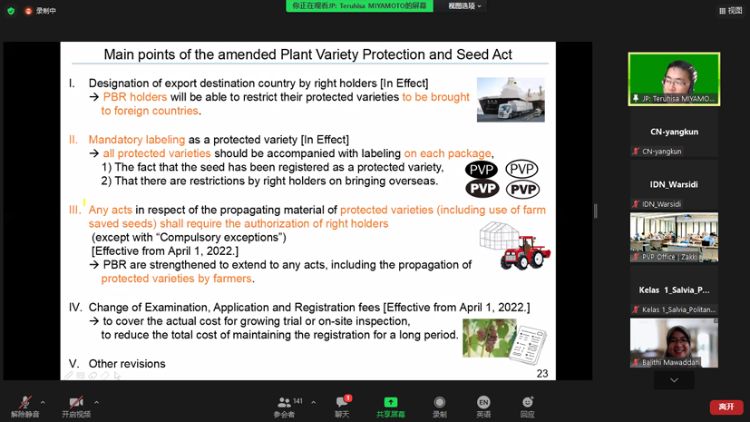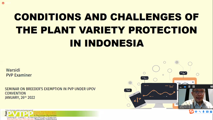 2022年1月26日,由印度尼西亚农业部植物品种保护与农业许可中心承办的东亚植物品种保护论坛系列活动——“UPOV公约下植物品种保护育种者豁免研讨会”以视频会议方式召开,来自UPOV和东盟10+3国家的124名代表参加会议,受东亚植物品种保护论坛办公室邀请,中国农业科学院蔬菜花卉研究所派杨坤副研究员参加会议。