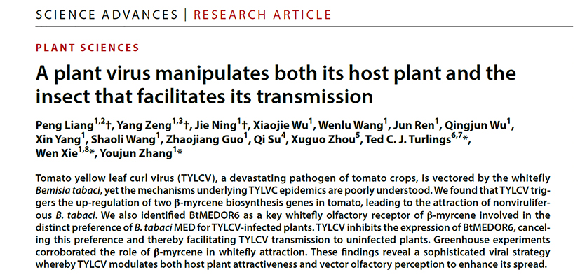 中国农业科学院蔬菜花卉研究所张友军研究员、谢文研究员和瑞士纳沙泰尔大学Ted C. J. Turlings教授为论文共同通讯作者,已毕业博士研究生梁鹏(现就职于天津市农业科学院植物保护研究所)、和曾阳(现就职于湖北师范大学)及硕士研究生宁杰为本文共同第一作者,本研究得到了国家重点研发计划、国家自然科学基金创新群体和中国农业科学院科技创新工程等项目资助。