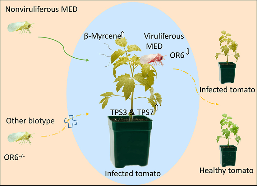通过基因功能鉴定实验,发现Q烟粉虱气味受体OR6能特异结合月桂烯,进而帮助不带毒Q烟粉虱定位TYLCV侵染的番茄。而当TYLCV进入Q烟粉虱体内后又会抑制烟粉虱OR6基因的表达,使得Q烟粉虱失去对TYLCV侵染番茄的趋性,继而迅速完成病毒的获取和传播过程。