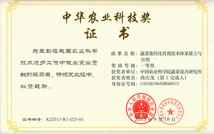 综合应用生物学、农业工程学原理,研发了蔬菜育苗基质标准化配制、种子复合消毒、精量播种、徒长综合防控、梯度灌溉施肥、化学诱抗、根际微生态调控等关键技术和产品,创建了“集中、集约、节约”为显著特征的蔬菜集约化育苗技术体系。技术在全国示范推广,显著节约了育苗基质用量和育苗设施成本,提高了劳动效率,推动了全国蔬菜育苗科技进步和产业发展,并取得显著社会经济效益。技术成果获2015年农业部中华农业科技奖一等奖。