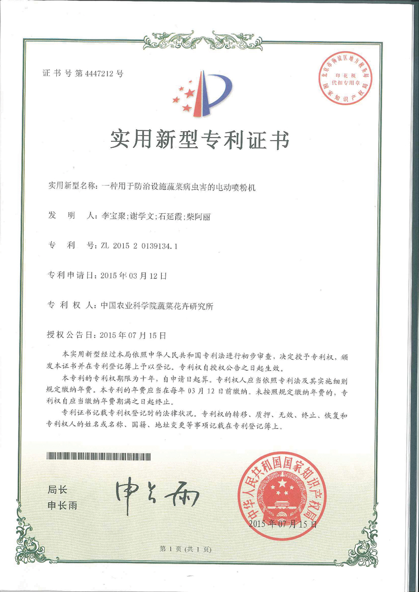 (27)一种用于防治设施蔬菜病虫害的精量电动喷粉机,ZL201520821233.8