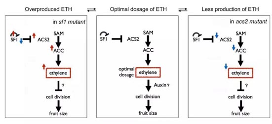 在这项研究中,研究人员以两个黄瓜的短瓜材料(sf1突变体和acs2 突变体)为对象,研究了乙烯剂量精细调控黄瓜果实伸长的分子机制。sf1突变体表现为果实细胞分裂减弱并且产生过量乙烯;acs2 突变体表现为果实细胞分裂减弱但是产生的少量的乙烯。SF1  (Short Fruit 1) 编码一个E3泛素连接酶,该研究发现,SF1泛素化修饰并降解自身及其底物ACS2 (乙烯合成途径中的限速酶,1-Aminocyclopropane-1-carboxylate synthase 2);SF1突变后, 导致ACS2积累,从而促进乙烯过量合成;研究进一步揭示了乙烯对黄瓜果实长度调控的剂量依赖性,过高或过低的乙烯剂量都会对黄瓜果实细胞分裂产生严重的抑制,而合适剂量的乙烯会促进细胞分裂,调控黄瓜果实伸长。因此,SF1通过泛素化降解其自身和ACS2实现对黄瓜果实中乙烯剂量的精细控制,从而调控黄瓜果实伸长。以上研究为理解葫芦科果实形态建成的遗传和分子基础提供了重要的信息。