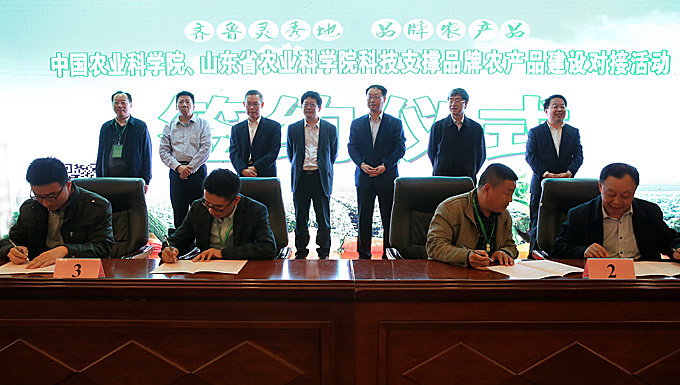 4月20日,中国农业科学院和山东省农业科学院科技支撑品牌农产品建设对接活动在寿光举行,两院与寿光蔬菜、潍县萝卜、滕州马铃薯、胶州大白菜、金乡大蒜、烟台苹果、文登西洋参、酿酒葡萄、渤海黑牛、汶上芦花鸡十大区域公用品牌所在地方政府签订了科技支撑区域公用品牌建设合作协议,两院协同创新团队与12家知名农产品企业签订了科技支撑企业产品品牌建设合作协议。