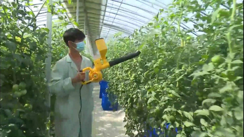 图为山东兰陵蔬菜基地工作人员正在应用弥粉法施药技术防治设施蔬菜病害
