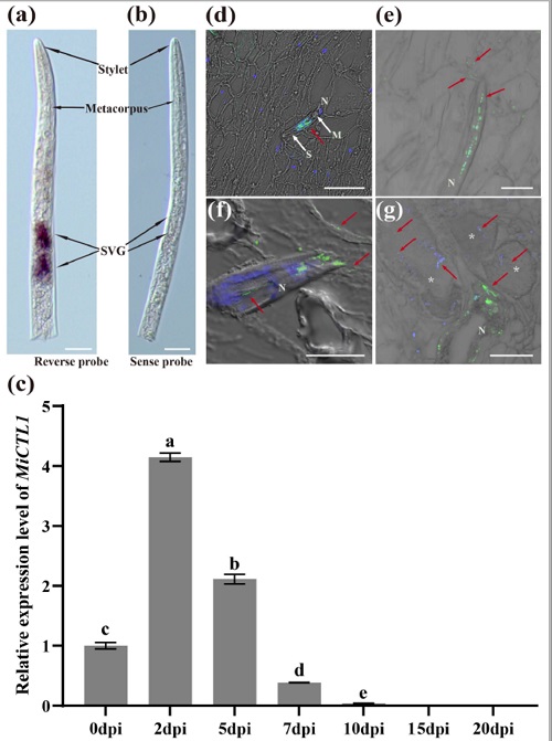 论文共同第一作者、中国农业科学院蔬菜花卉研究所赵建龙博士介绍,他们研究证明,南方根结线虫凝集素类效应蛋白MiCTL1在亚腹食道腺表达、在寄生过程分泌到植物组织中,在线虫寄生初期表达量显著增加,推测其可能在线虫与宿主互作、取食位点建立、巨大细胞形成和调节植物免疫方面发挥重要作用。