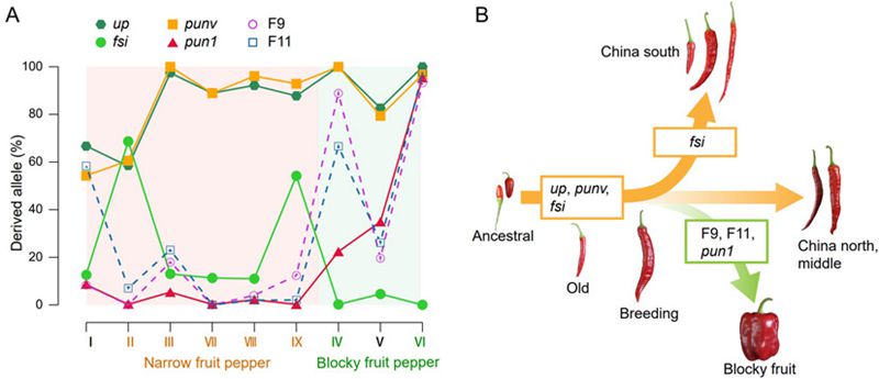 通过不同群组的变异和遗传多样性比较,从全基因组水平揭示了辣椒从野生/祖先种、地方品种到类型多样化的现代栽培品种的驯化改良过程(图1)。首次提出辣椒栽培群体的演化经历了两步驯化过程:第1群组果实小,第一步驯化使辣椒果实变长、辣度增加,形成了以地方品种为主的第2组;第二步驯化使辣椒果实进一步变长和变大、果重增加,而辣度则显著降低,形成了育种改良的第3组。辣椒的两步驯化过程伴随不同类型基因集受到强烈的驯化选择。同时,研究揭示了第4和第6组灯笼椒的驯化历史相对较短,首次发现了位于9号和11号染色体上的两个野生基因组片段的关键渗入事件以及辣椒素调控基因Pun1的强烈选择清除与大果灯笼椒(甜椒)的形成密切相关。特别地,研究还发现第9群组在中国辣椒类群中的遗传多样性最高,提示中国西南部可能是辣椒引入较早和来源丰富的地区,具有一定的次级起源或多样化中心的特征。