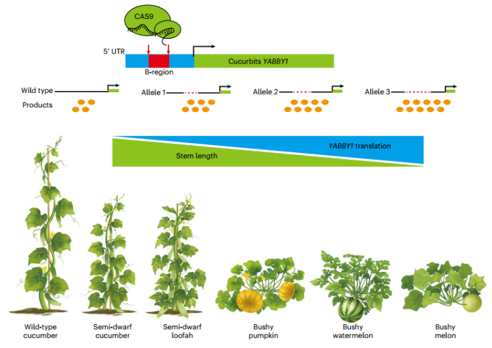 为了解决这一难题,该研究团队在南瓜种质库中寻找到唯一一份由显性单基因控制的矮化种质。遗传验证揭示南瓜CmoYABBY1基因的5’非翻译区上的一段76个碱基的缺失,通过增强CmoYABBY1的蛋白翻译水平,使得南瓜主茎极度缩短。该76个碱基的序列中存在一个在葫芦科作物中保守调控元件,利用基因编辑工具对黄瓜和西瓜中的该保守调控元件进行靶向删除,实现了茎长的精细调节。团队根据不同瓜类作物的不同栽培模式,将编辑获得的新等位基因植株进行精确配置,发现编辑的矮化植株可以显著的提高单产或显著降低劳动力成本。