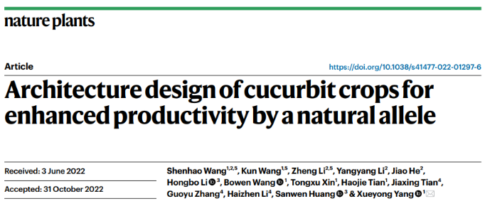 光明网讯(记者宋雅娟)近日,中国农业科学院蔬菜花卉研究所蔬菜功能基因组团队联合国内多家合作单位,提出了一种定向人工进化策略创造了葫芦科瓜类作物的全新紧凑株型,大大提高了葫芦科瓜类作物的生产效率。相关研究成果发表在《自然植物(Nature Plants)》上。
