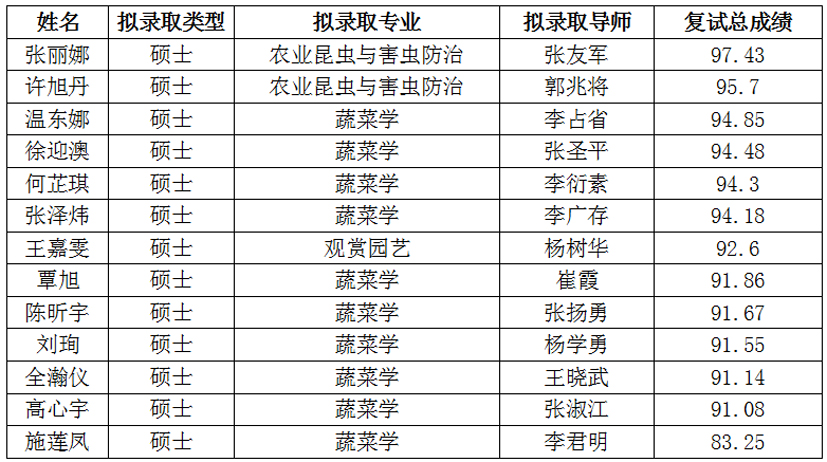 蔬菜花卉研究所2022年度推荐免试生拟录取名单公示