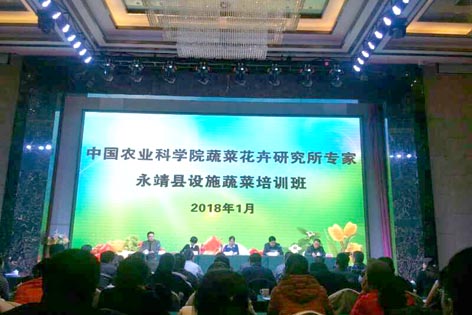 为进一步贯彻落实十九大报告提出的实施乡村振兴战略和打赢脱贫攻坚战的任务,1月20-21日,蔬菜花卉研究所在甘肃省永靖县举办了设施蔬菜安全高效生产技术培训班,研究所成果转化处李瑞云处长和张志刚副研究员、蔬菜栽培专家余宏军研究员、综合防治专家柴阿丽副研究员分别做了培训报告,并提供了茄子、辣椒、番茄、黄瓜等9个蔬菜新品种供其试种选择。永靖县农业技术人员、农民专业合作社负责人和蔬菜种植大户等130余人参加培训。