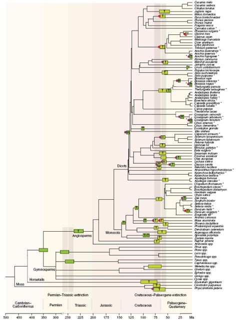 植物进化关系树及发生在各个时间点上的各种基因组多倍化事件。