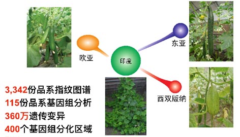 为加快蔬菜遗传育种研究进程,中国农业科学院蔬菜花卉研究所研究人员抓住新一代基因组测序技术出现的契机,破解了第一个蔬菜作物-黄瓜的基因组遗传密码,以此为基础,研究了世界上主要黄瓜资源的全基因组遗传变异,证实了黄瓜原产于印度,经过人类驯化选择成为人们喜欢的蔬菜,后来传播到不同地域,形成了三个主要类型:欧亚黄瓜、东亚黄瓜、西双版纳黄瓜,发现东亚黄瓜与印度黄瓜的分离时间是2000多年,与张骞出使西域给中国带来这个大众蔬菜的史实相吻合。以上成果为发现黄瓜重要农艺性状控制基因提供了重要的资源和信息,也为黄瓜种质资源的育种利用提供了理论框架,以此为基础我国科研人员已克隆和定位了50多个黄瓜农艺性状基因,推动黄瓜育种进入分子设计时代。