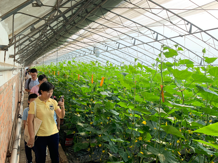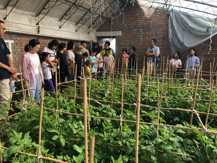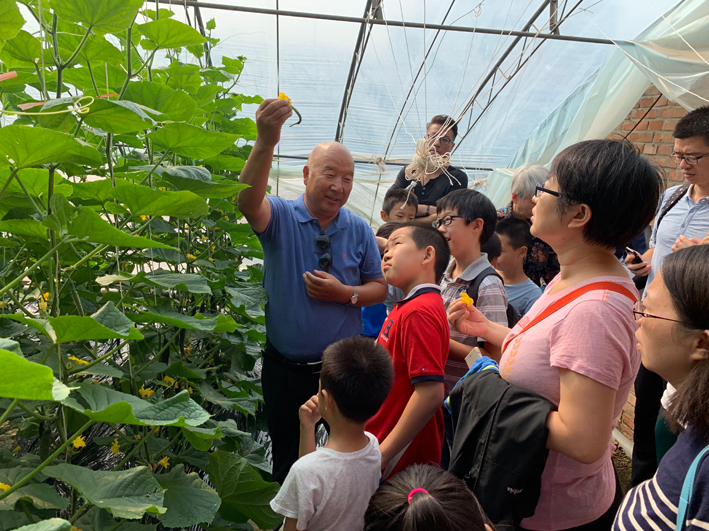 参观黄瓜大棚,试验农场场长马宾生为小朋友讲解黄瓜授粉过程