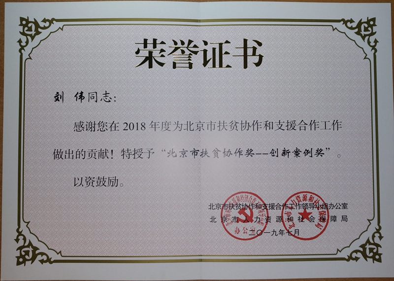 为充分肯定北京市扶贫协作工作取得的丰硕成果,展现广大扶贫工作者无私奉献、顽强拼搏、团结协作的良好精神风貌,进一步凝聚合力、激发动力,北京市扶贫协作和支援合作工作领导小组办公室、北京市人力资源和社会保障局决定,对2018年度表现突出的个人和集体授予“北京市扶贫协作奖”,其中北京市扶贫协作奖-创新案例奖20名,中国农业科学院蔬菜花卉研究所刘伟研究员名列其中。