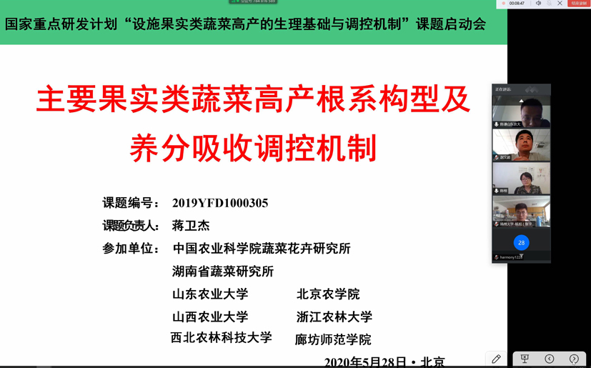 2020年5月28日,由中国农业科学院蔬菜花卉研究所主持的国家重点研发项目“设施果实类蔬菜高产的生理基础与调控机制”课题五“主要果实类蔬菜高产根系构型及养分吸收调控机制”以视频会议的形式召开课题启动会。会议邀请专门从事作物根系研究的中国科学院遗传与发育生物学研究所李传友研究员、山东大学丁兆军教授、福建农林大学陈栩教授到会对课题和子课题的内容进行点评。