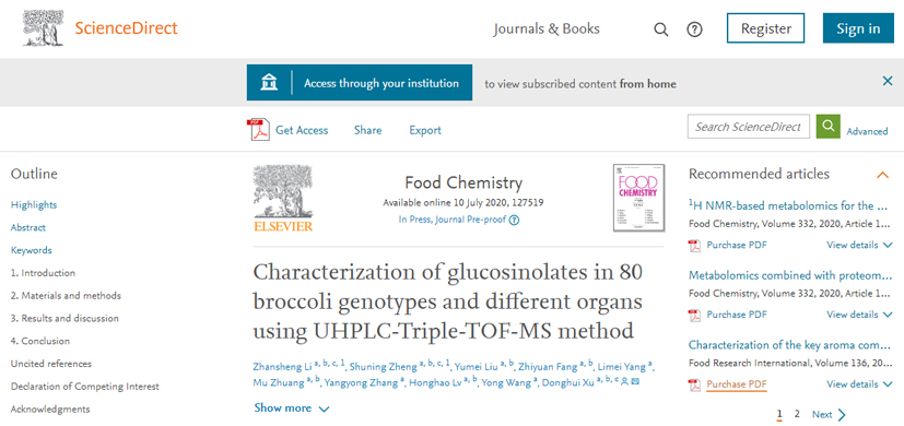 7月10日,中国农业科学院蔬菜花卉研究所甘蓝青花菜课题与质量安全课题的研究成果:“Characterization of glucosinolates in 80 broccoli genotypes and different organs using UHPLC-Triple-TOF-MS method”发表于《Food Chemistry》(5-Year IF= 6.219)上。