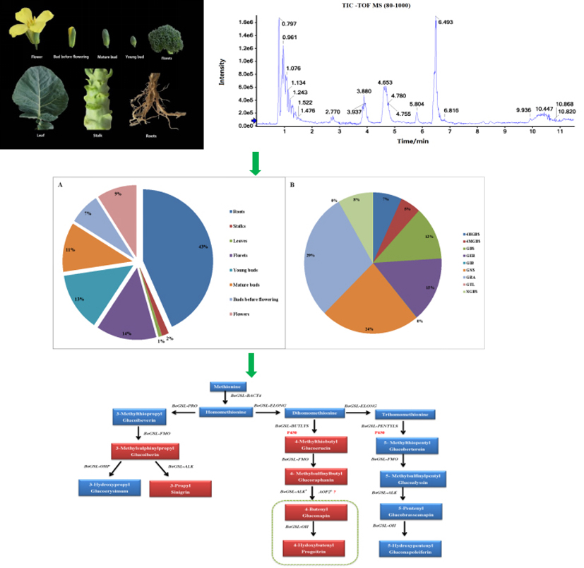 硫甙是十字花科作物中特有的次生代谢物,目前已知的大约有120多种成分,这些成分及其代谢产物与蔬菜风味、植株抗性和人体营养等密切相关,一直是国内外的研究热点。青花菜因营养全面被誉为“蔬菜皇冠”,其富含的硫甙组分Glucoraphanin(GRA、RAA)能够降解生成抗癌活性极强的物质——莱菔硫烷(Cancer cell、Nature、Cancer research等),其独特的抗癌机制已成为当前攻克癌症等医学研究的重要方向之一。本研究采用UHPLC-Triple-TOF-MS技术,通过对80份不同基因型青花菜花球(商品器官)和6份高代自交系不同发育器官中硫甙成分测定,解析了青花菜各发育器官中富集的12种硫甙成分及其分属类型(脂肪族、吲哚族和芳香族硫甙),阐明了青花菜各器官中硫甙分布的遗传多样性和分布规律,同时结合硫甙代谢途径和侧链修饰环节,从80份基因型中发现了2份突变体材料(基于Glucoraphanin烯基化变为Gluconapin),为深入研究青花菜硫甙代谢C4途径和抗癌活性成分莱菔硫烷(Sulforaphane)的积累规律奠定了重要基础。