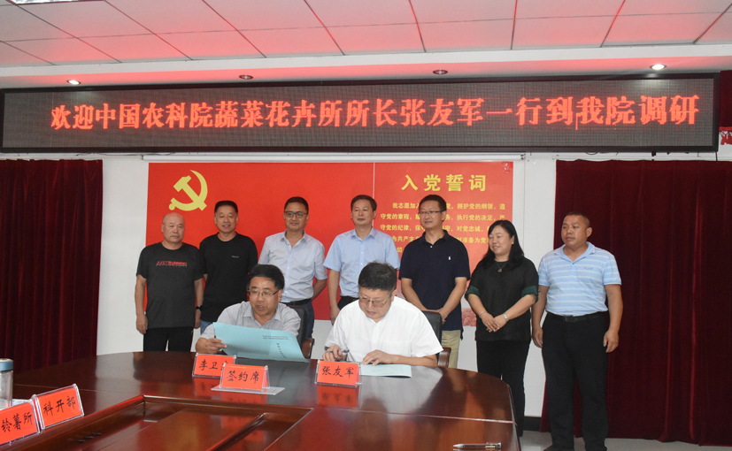 李卫东院长与张友军所长分别介绍了恩施农科院与中国农科院蔬菜花卉所的基本情况,就科研资源共享、人才交流、项目合作等签署了《中国农业科学院蔬菜花卉研究所-恩施土家族苗族自治州农业科学院战略合作框架协议》,以期发挥各自在科研和产业转型升级方面的优势,全面建立技术咨询、人才培养、项目合作机制,立足恩施州特色优势资源,建立长期战略合作关系。张友军所长表示,蔬菜花卉研究所和恩施州农科院需立足当地需求和产业问题,利用好双方的科技人才、科研平台及资金,科学谋划、主动作为,助推恩施州绿色兴农之路。