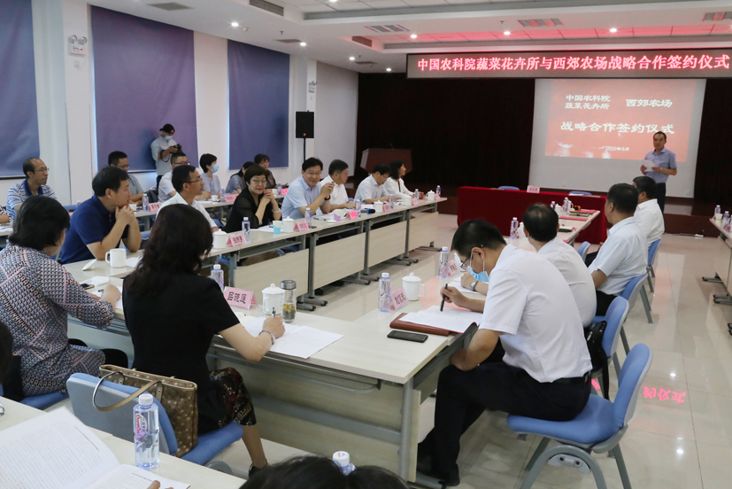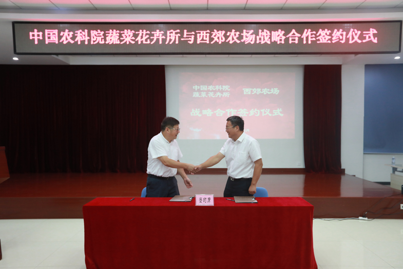 9月9日,中国农业科学院蔬菜花卉研究所与首农食品集团北京西郊农场签定战略合作协议,共同打造中国农业科学院支持和服务地方农业科技发展的样板品牌。中国农业科学院副院长、党组成员刘现武,蔬菜花卉研究所所长张友军,海淀区农工委书记、农业农村局局长张春明,海淀区农业农村局副局长鲁书强,首农食品集团副总经理常毅、北京市西郊农场有限公司党委书记管建国参加签约仪式席并讲话。仪式由西郊农场总经理张振民主持。