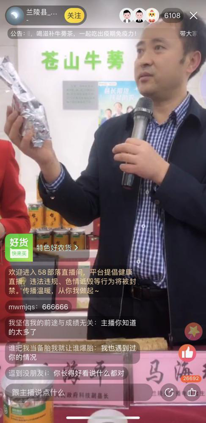做好“主播”带好货。山东兰陵加入58同城爱心助农计划,4月10日晚,王海平以副县长身份,将兰陵特产大蒜、辣椒、滋补牛蒡茶等带到58部落直播间,吸引了17142名网友观看并下单购买特色农产品。