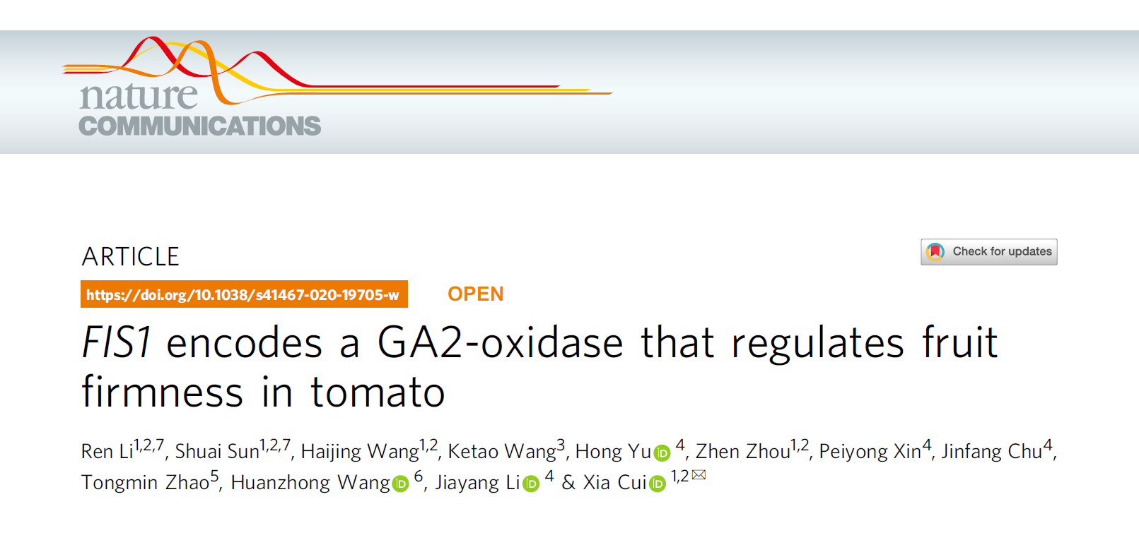 近日,我所崔霞课题组克隆了番茄中果实硬度关键调控基因FIS1,并揭示了该基因在番茄果实硬度形成中的功能,解析了赤霉素通路介导的番茄果实硬度的调控机制,为改良果实硬度提供了新的位点和策略。相关研究内容“FIS1 encodes a GA2- oxidase that regulates fruit firmness in tomato”于11月17号在线发表于《Nature Communications》上。
