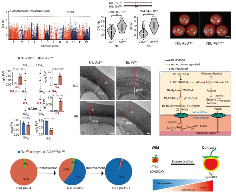 研究者利用番茄的重组自交系群体,通过关联分析获得了一个调控番茄果实硬度的主效QTL位点qFIS1。图位克隆发现该位点是由于一个编码赤霉素2-氧化酶的基因FIS1的突变造成的。栽培番茄中FIS1的突变,导致果皮中活性赤霉素含量升高,果皮角质层发生变化,角质和蜡质合成增多,因此果实硬度增加、货架期延长。除此之外, FIS1对果实硬度的改变,并不影响果实发育和风味等重要性状。对该位点进行基因编辑改良,可以显著增加番茄果实的硬度。因此该研究不仅首次证明了赤霉素参与调控番茄果实成熟过程中的果实硬度形成, 而且为果实硬度的育种选择和定向改良提供了理想靶点。