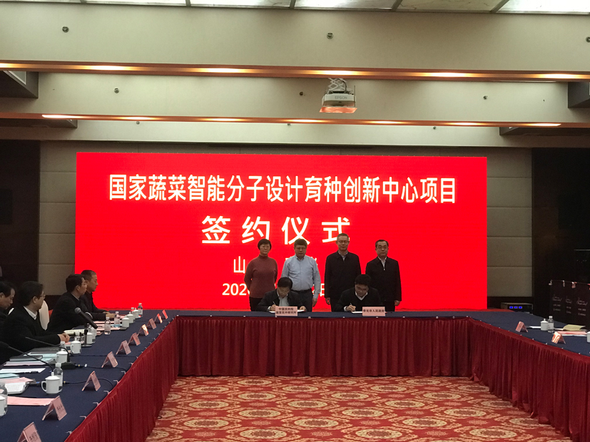 随后,双方举行了“国家蔬菜智能分子设计育种创新中心”项目签约仪式,先由张圣平副所长介绍了项目推进情况,双方围绕项目进行了友好协商。最后,由张圣平副所长与寿光市委常委、统战部部长曹建国代表双方共同签署了“国家蔬菜智能分子设计育种创新中心”合作共建协议。