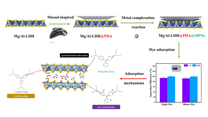 研究表明贻贝具有惊人的粘附性能和机械性能,这种超强粘弹性主要源于足腺分泌的粘蛋白(含有10%的3,4-二羟基苯丙氨酸DOPA,类儿茶酚结构基团)与三价铁离子(Fe3+)通过化学配位和共价交联作用形成的高分子网状弹性聚合物。受此启发,研究团队通过自氧化聚合将多巴胺(DA)均匀修饰在二维层状双金属氢氧化物(LDH)表面,形成聚多巴胺仿生界面(LDH@PDA);利用含儿茶酚基团的单宁酸(TA)与Fe3+的金属-有机络合反应,在LDH@PDA上锚定具有多孔结构的金属-多酚网络(MPNs),借助PDA和MPNs的界面协同互作,赋予材料更多表面活性位点,进而提升其粘附和吸附特性。