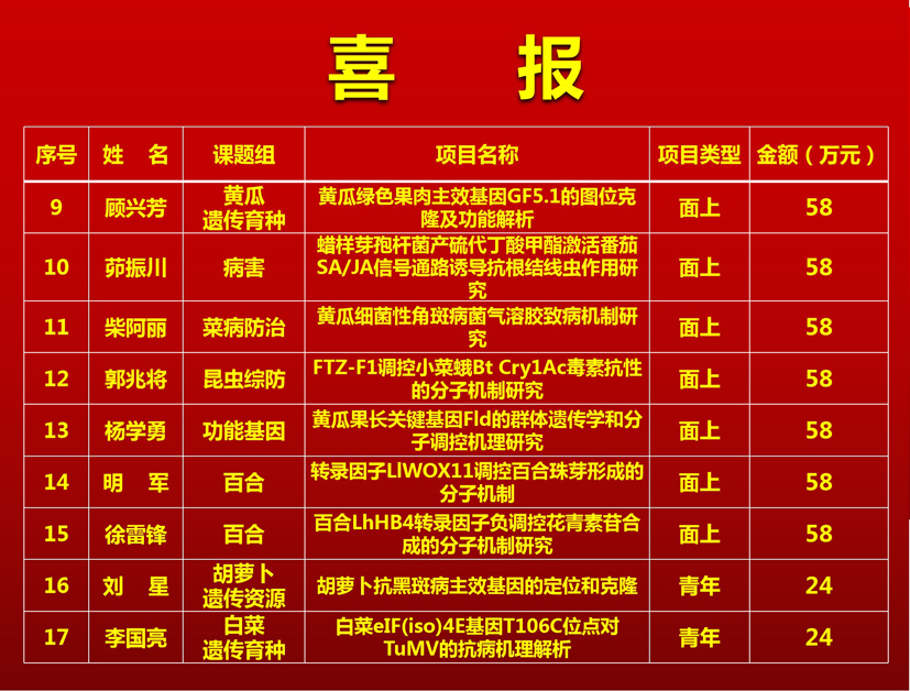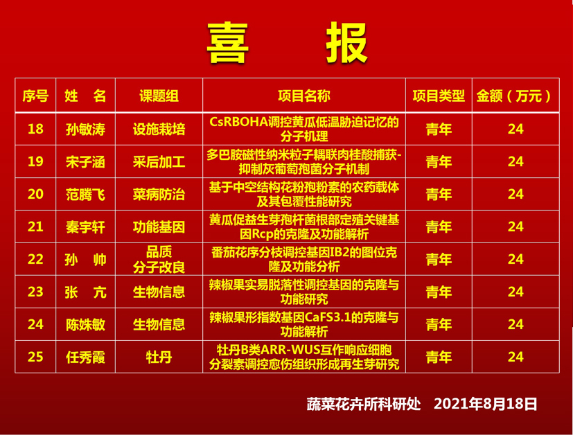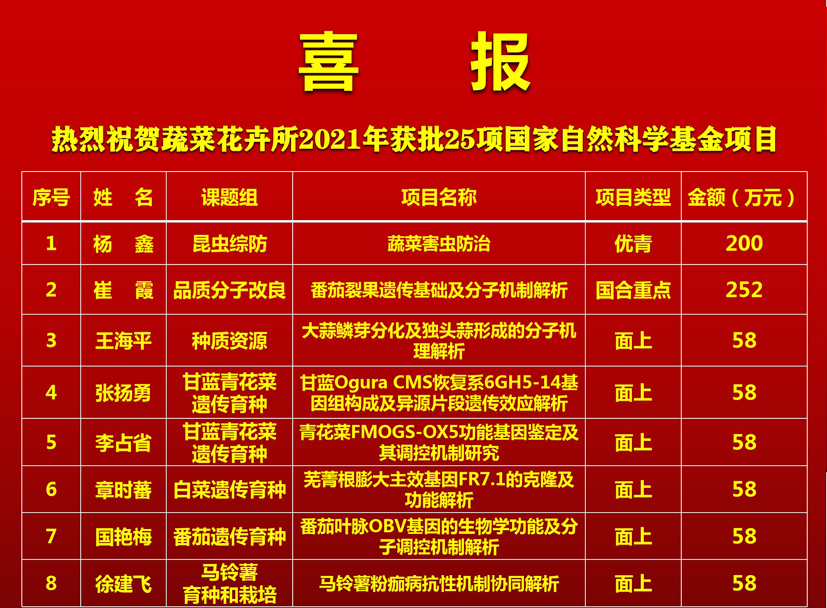 根据国家自然科学基金委最新发布2021年度基金项目评审与资助结果,中国农科院蔬菜花卉研究所2021年度共获得批准立项25项,其中优秀青年科学基金项目1项(蔬菜虫害防控团队杨鑫副研究员)、国际合作重点项目1项(蔬菜功能基因组学团队崔霞研究员)、面上项目13项,青年基金项目10项,直接经费总额1446万元,列居全院第三位,资助率高达33.3%,列居全院第一位,实现本所基金资助数量和资助金额历史最高,为“十四五”自然基金获批立项赢得了良好开局。