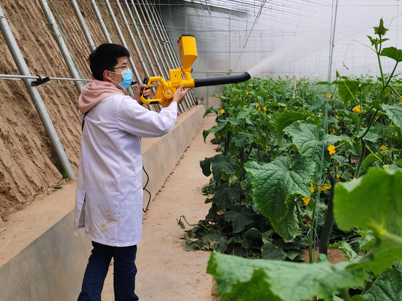 我国是蔬菜产业大国,设施蔬菜产业的发展,解决了蔬菜周年均衡供应的问题,也在促进农民增收和高效利用农业资源等方面做出历史性贡献,但同时带来了严重的高湿病害问题。针对蔬菜高湿病害频发、传统喷雾施药费时费力且对高湿病害效果甚微等设施蔬菜产业“卡脖子”难题,蔬菜病害防控创新团队基于蔬菜高湿病害防控需求,以轻简、高效、智能、安全为导向,经过多年的研究,前后四代喷粉机的研制改良,研发出有效防控高湿病害、且充分满足市场需求的轻简化专用施药设备—全新系列手持式精量电动弥粉机,并实现产业化应用。近年来,中蔬弥粉机在我国北京、山东、河北、辽宁、浙江等设施蔬菜产区广泛推广,累计应用面积达到1000万亩,表现出显著的优势。采用中蔬弥粉机施药操作便捷,亩用时3-5 min,节省90%以上的施药劳动力投入,农药利用率提高20%以上。中蔬弥粉机的推广应用,有效解决了传统喷粉设备无法精量控粉的难题,在设施菜田高湿作业工况下,显著提高施药的精确度和工作效率,为我国设施蔬菜健康、稳定、可持续发展提供有力的保障。