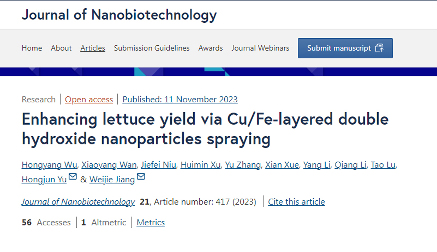 近日,中国农业科学院蔬菜花卉研究所蔬菜栽培与生理创新团队在国际知名学术期刊《Journal of Nanobiotechnology》(IF: 10.2)上发表了题为“Enhancing lettuce yield via Cu/Fe-la...
