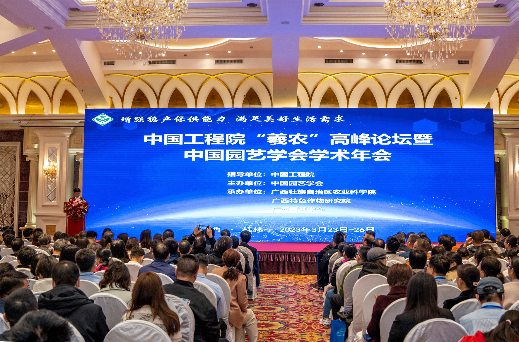中国工程院 “羲农” 高峰论坛暨中国园艺学会2022 年学术年会于2023年 3月23—26日在广西桂林隆重召开。大会以深入学习贯彻党的二十大精神,增强稳产保供能力,满足美好生活需求为主题。