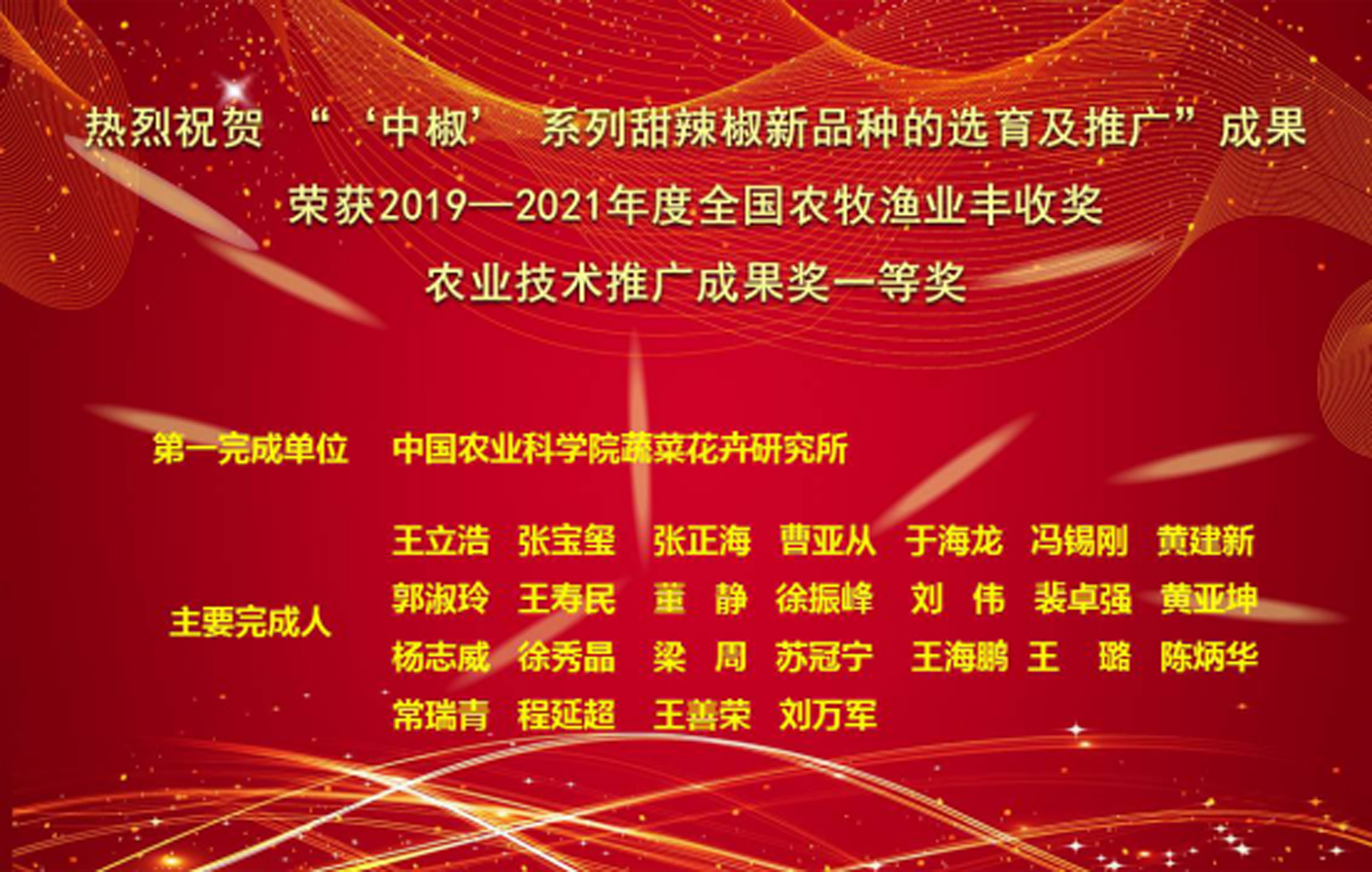 • 2022-09-30 热烈祝贺 “‘中椒’系列甜辣椒新品种的选育及推广”成果荣获2019—2021年度全国农牧渔业丰收奖一等奖