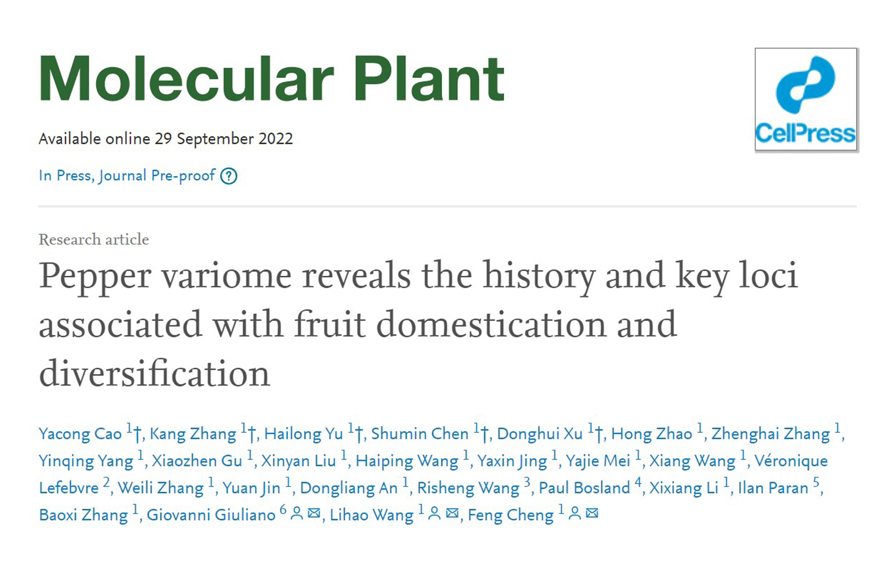 近日,中国农科院蔬菜花卉所王立浩研究团队和程锋研究团队在Molecular Plant (IF: 21.949)发表题为Pepper variome reveals the history and key loci associated w...