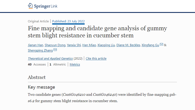 近日,中国农业科学院蔬菜花卉研究所葫芦科蔬菜遗传育种创新团队在黄瓜蔓枯病抗性研究方面取得重要进展。该研究将成株期茎蔓的蔓枯病抗性QTL位点gsb-s6.2定位到34 kb区间内,并预测了2个关键候选基因。相关研究结果以 “Fine mapp...