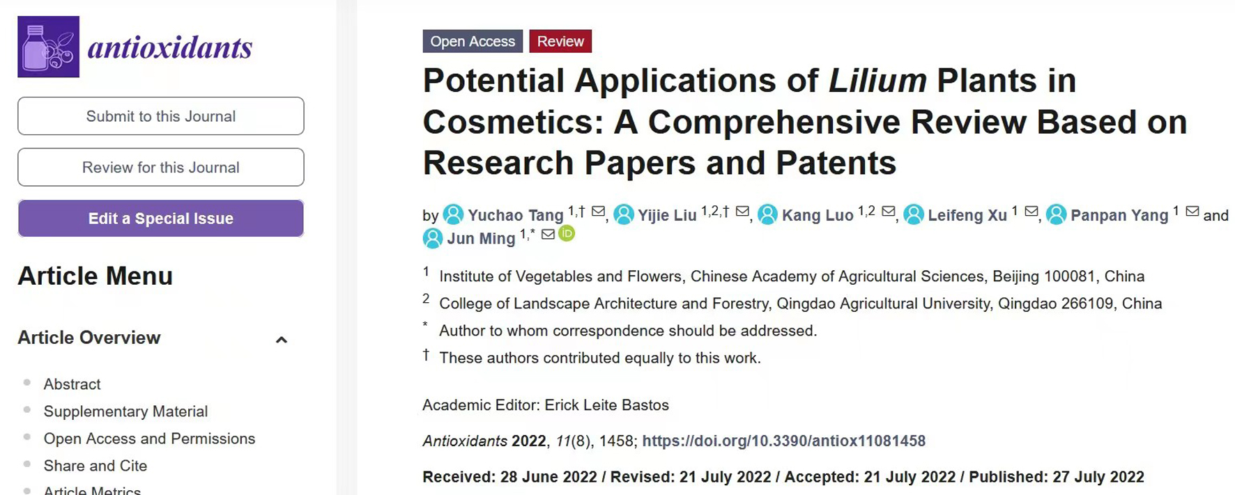 • 2022-07-29 蔬菜花卉所百合课题组综述了百合属植物在化妆品中的潜在应用