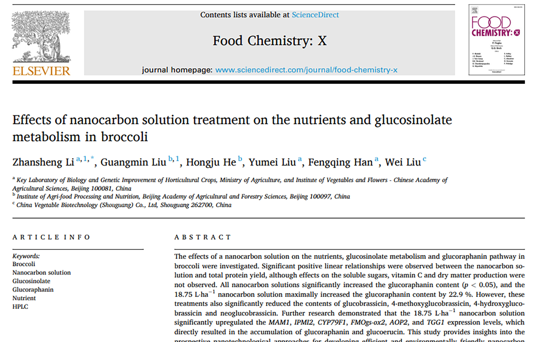 8月17日,中国农业科学院蔬菜花卉研究所甘蓝类蔬菜遗传育种创新团队在纳米碳溶液对青花菜营养成分和硫甙代谢的影响研究方面取得重要进展,为青花菜深加工助力乡村振兴和采用科技手段精准调控其营养提供了技术支撑和科学依据。该研究结果以 “Effect...