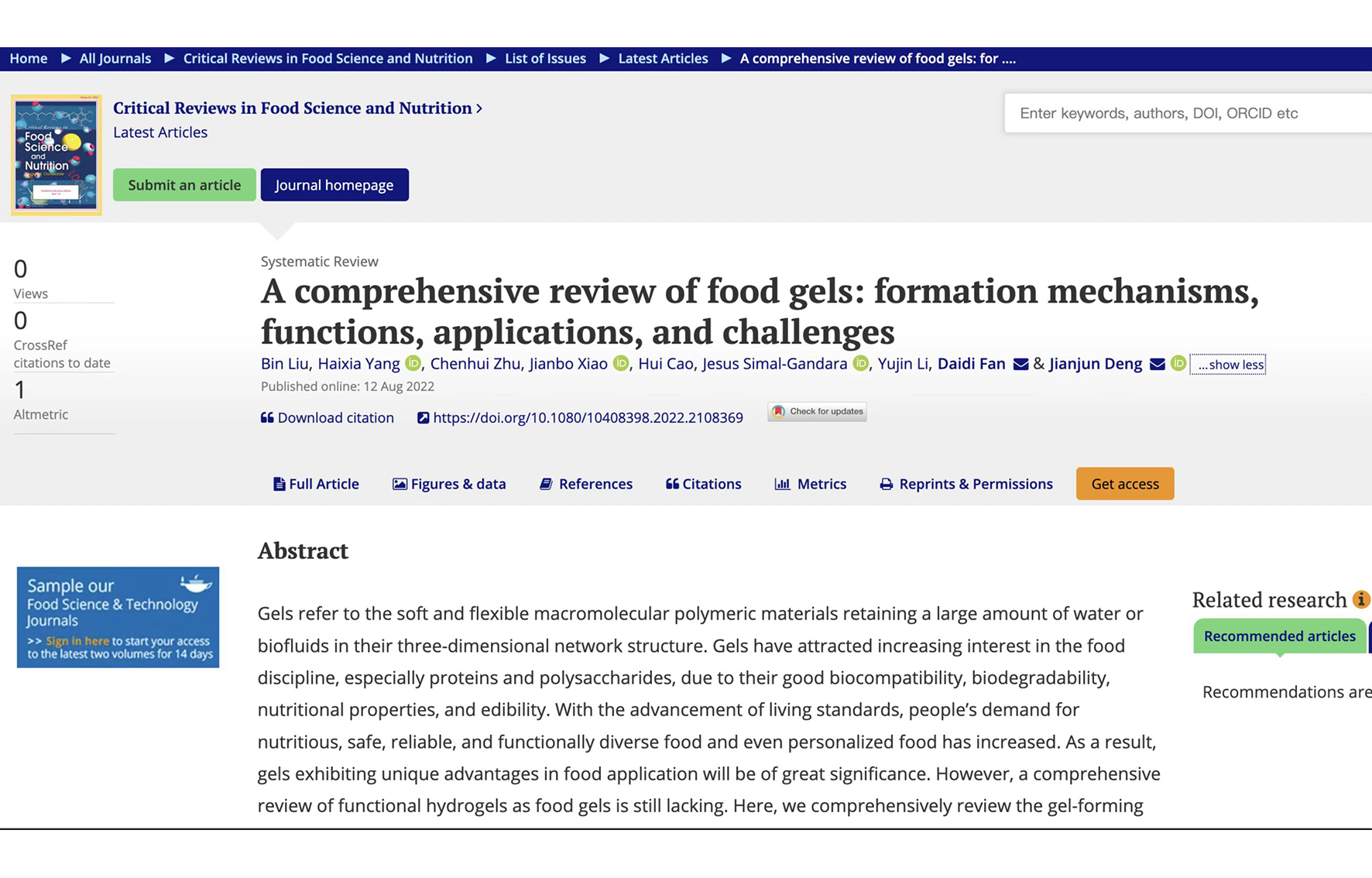 近日,中国农业科学院蔬菜花卉研究所采后加工课题组系统总结了食品凝胶的形成机制、功能特性、应用现状及未来面临的挑战。相关内容“A comprehensive review of food gels: formation mechanisms,...
