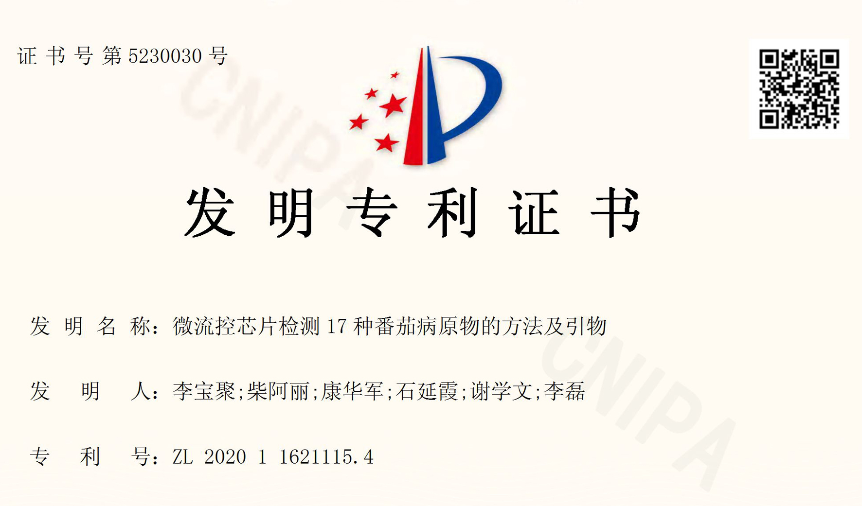 • 2022-06-24 蔬菜病害防控创新团队喜获番茄病原菌微流控芯片检测专利授权