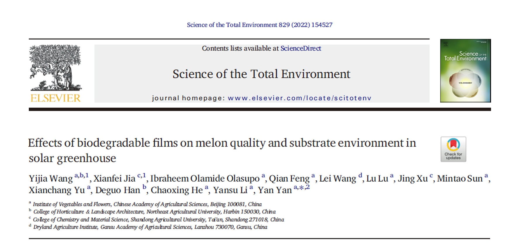 近日,中国农业科学院蔬菜花卉研究所设施栽培课题组闫妍副研究员发现,使用PBAT/PLA和PBAT/木质素两种生物可降解地膜对日光温室秋冬季甜瓜产量和品质。相关研究成果以“Effects of biodegradable films on m...