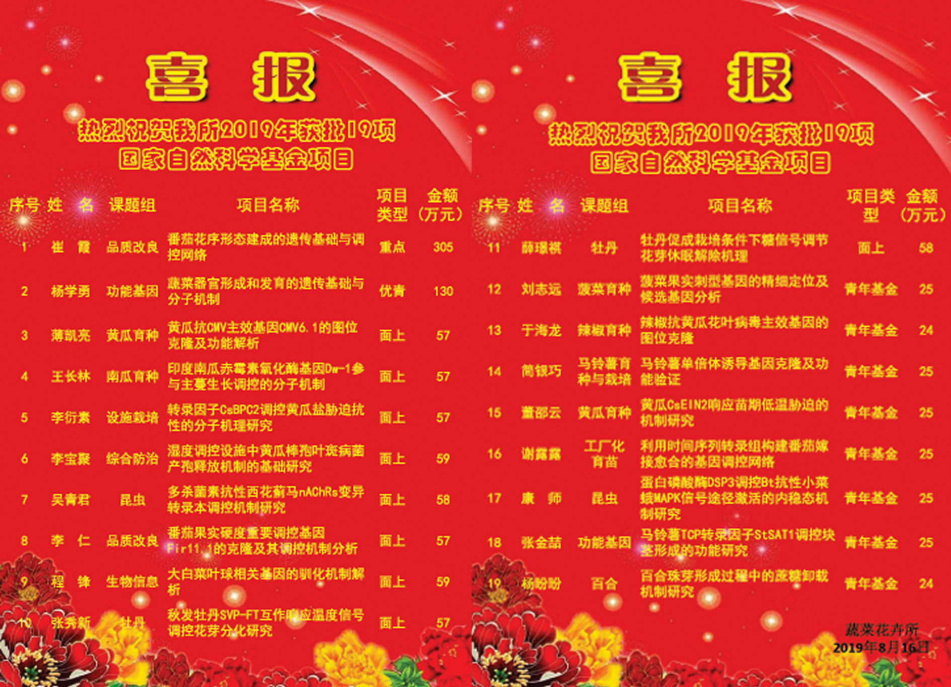 根据国家自然科学基金委员会发布的项目评审与资助结果,蔬菜花卉研究所2019年共获得各类基金项目19项,其中青年基金项目8项,面上项目9项,优秀青年...