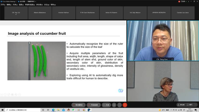本次会议时间压缩到北京时间18:00-21:30,中间休息半小时。本届会议共有16个程序,重点听取并讨论了技术和信息文件进展、品种命名规则进展、测试指南及模板进展、DUS测试工具和方法进展、表型组和图像分析进展、可共享软件和装备进展、UPOV信息和品种数据库及在线申请系统进展、分子技术及生物信息学进展、技术委员会和计算工作组参会情况统计、DUS审查合作等10个议题。英国的Adrian ROBERTS先生汇报并演示了一种新的COYU算法,该算法采用拟合函数SPLINE使得修正SD的曲线比之前的移动平均值法更加平滑。阿根廷的Alberto BALLESTEROS先生汇报了“光学标记:大麦、小麦和大豆品种识别新技术”,一种用于籽粒自动测量和识别的软硬件结合的图像分析技术。杨坤副研究员介绍了DUS团队近年来的研究成果“DUS测试大数据平台”和“DUS测试统计分析软件-DUSCEL3.0”。大数据平台以表型、分子和环境数据为核心,集成了智能移动采集、图像批量分析、大数据挖掘等技术,实现天空地一体化全天候自动DUS测试的目标。DUSCEL3.0软件基于Easy、Effective、Efficient的3E目标,实现跨试验一键式联合分析,该软件的2.0版本已经被UPOV/INF/16“可交换软件”接收,成为继英国、法国之后的第三款专门用于DUS测试数据分析的共享软件。