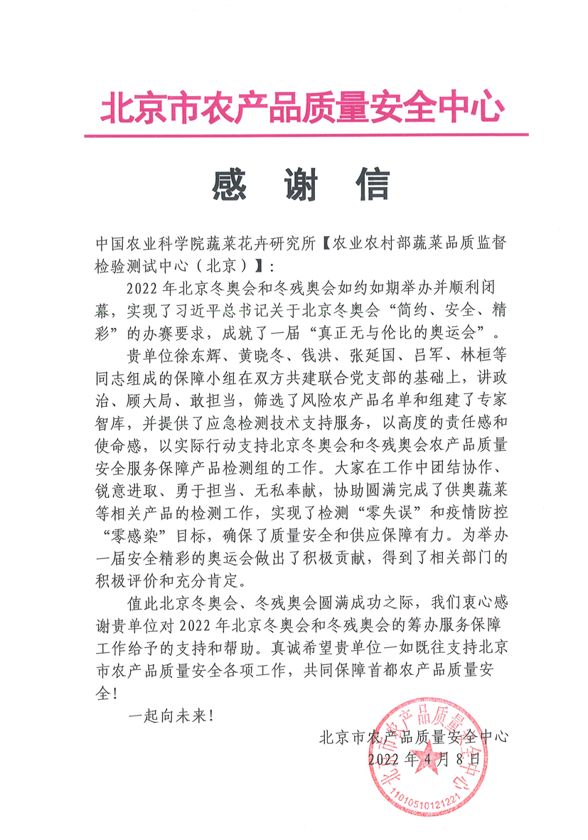 感谢信中指出:我所蔬菜质检中心徐东辉等人组成的保障小组在双方共建联合党支部基础上,讲政治、顾大局、敢担当,筛选了风险农产品名单,组建了专家智库,提供了应急检测技术支持和供奥蔬菜产品检测服务,实现了检测“零失误”和疫情防控“零感染”目标,确保了赛事期间农产品质量安全和供应保障有力,为举办一届安全精彩的奥运会做出了积极贡献。