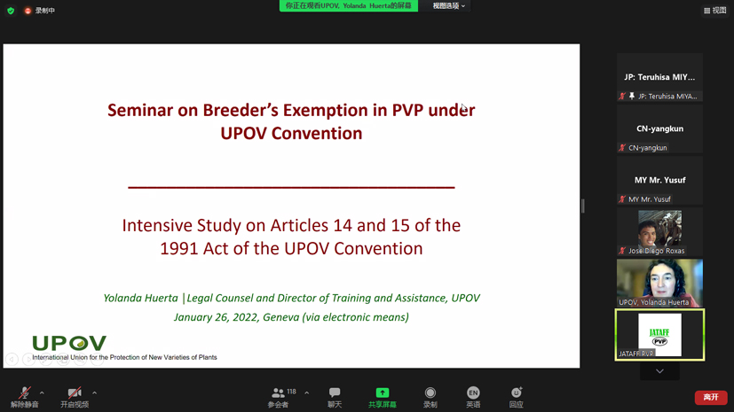 2022年1月26日,由印度尼西亚农业部植物品种保护与农业许可中心承办的东亚植物品种保护论坛系列活动——“UPOV公约下植物品种保护育种者豁免研讨会”以视频会议方式召开,来自UPOV和东盟10+3国家的124名代表参加会议,受东亚植物品种保护论坛办公室邀请,中国农业科学院蔬菜花卉研究所派杨坤副研究员参加会议。