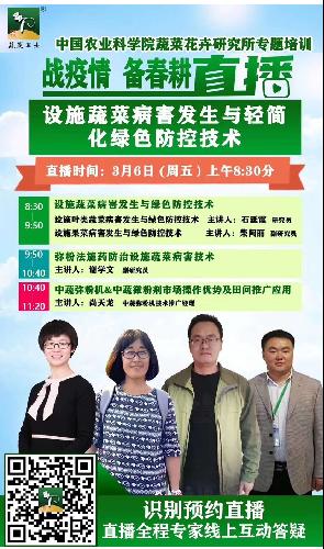 当前,全国疫情逐渐趋于稳定,各地蔬菜生产也逐渐恢复。作为蔬菜花卉学科唯一的国家级公益性专业研究机构,中国农业科学院蔬菜花卉研究所深入贯彻习近平总书记春耕生产重要指示精神,在疫情防控的前提下,有序高效的推动复工复产。针对今年早春阴雨高湿、蔬菜病害危害严重的情况,2020年3月6日,组织研究所植保专家开展了“战役情、备春耕”专题线上培训,详细讲解了设施蔬菜病害发生与轻简化绿色防控技术。